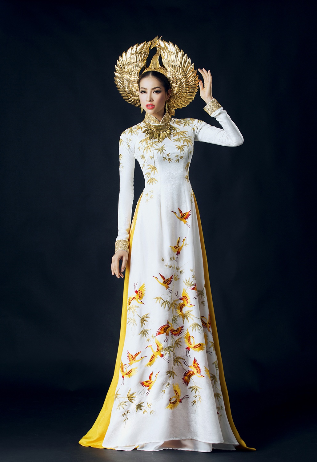 Hai thiết kế áo dài chung ý tưởng "Vũ khúc hạc" chính thức được giới thiệu với người hâm mộ trong bộ ảnh thực hiện trước khi người đẹp lên đường tham gia tranh tài tại Mỹ.