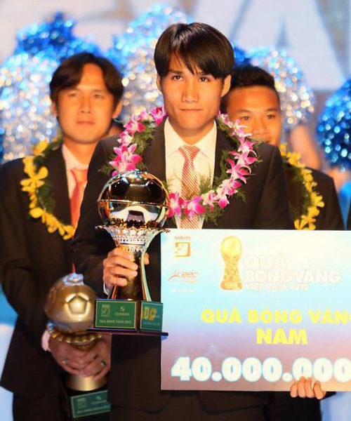 | Quốc Anh hạnh phúc khi giành Quả bóng vàng VN năm 2012. |