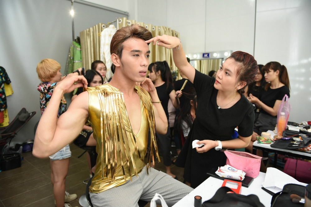 Quốc Đại make-up tại nhà trước khi đến sân khấu. Trong đêm thi, anh sẽ giả gái khi vào vai hoàng hậu Thượng Dương. |