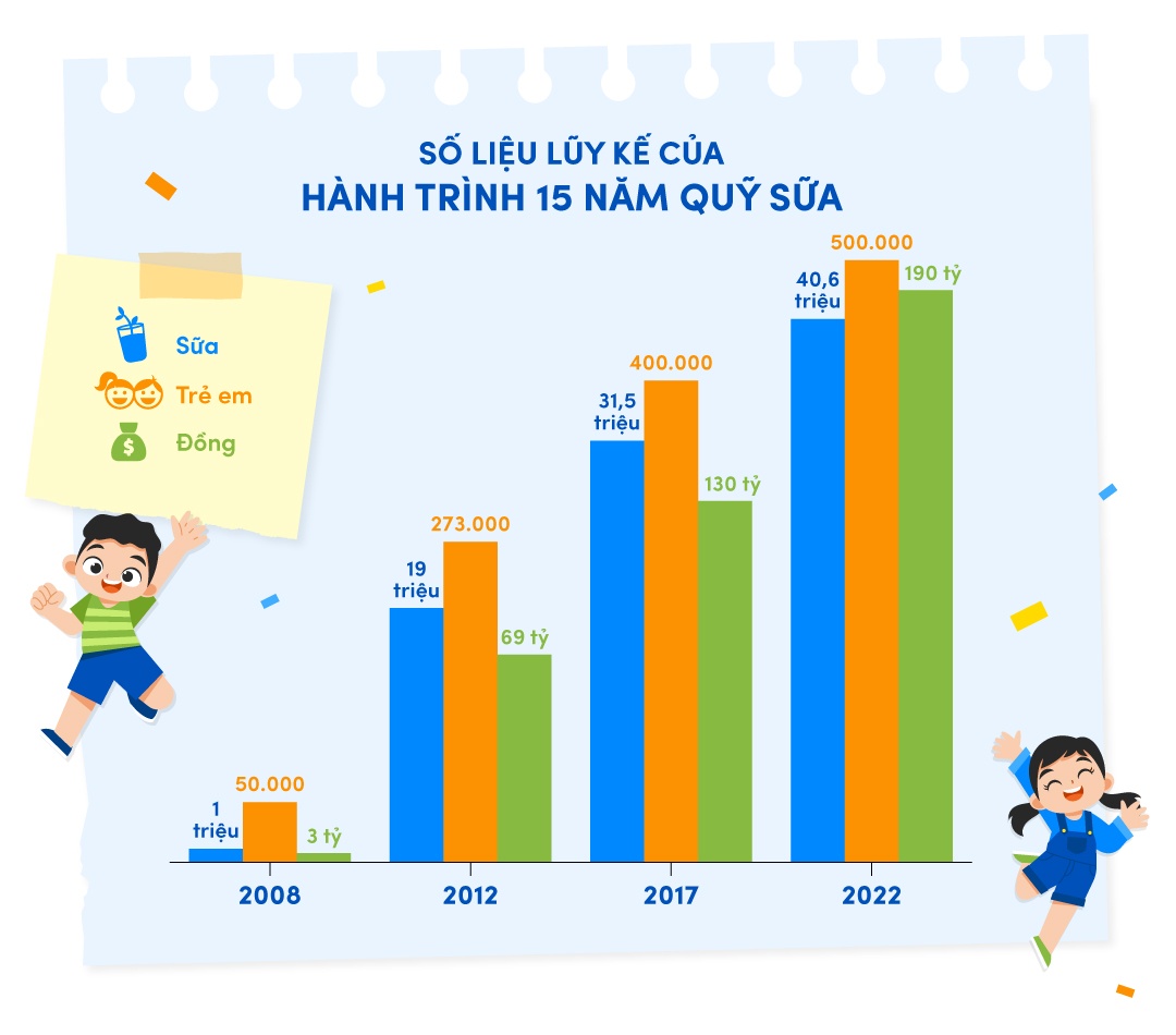 Khi đó, mục tiêu của chương trình được cụ thể với con số “1 triệu ly sữa” cho trẻ em khó khăn, kém may mắn với mong muốn để các bé có được thêm dinh dưỡng từ sữa, giúp cao lớn, khỏe mạnh hơn. Tại thời điểm đó, đây là một trong những chương trình tặng sữa có quy mô lớn nhất được thực hiện bởi doanh nghiệp.