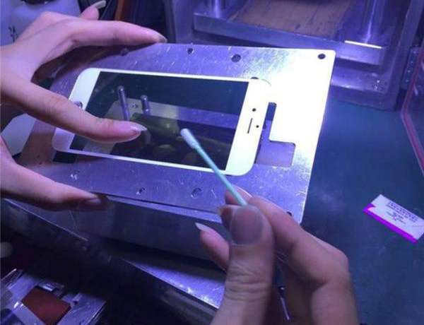 Sau khi cho vào máy cán, phần tấm nền và mặt kính đã được ép làm một. Đây là công đoạn vệ sinh màn hình máy.