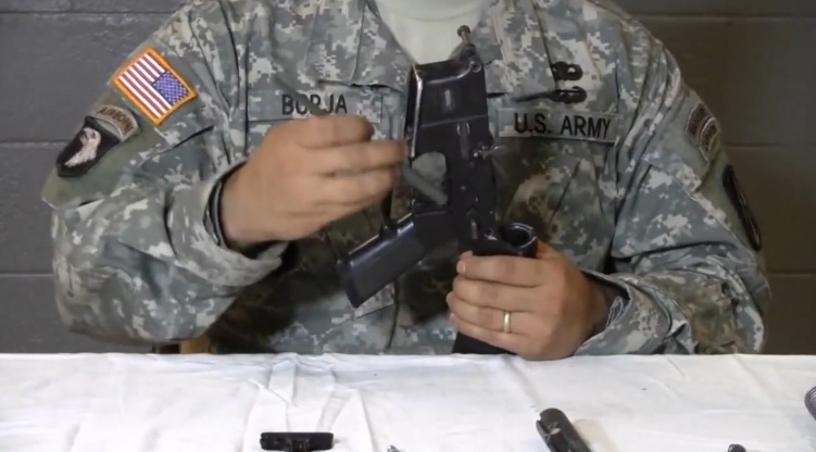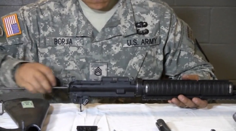 Lính Mỹ tách rời thân súng bằng cách tác động vào hai chốt trên thân súng trước khi tháo rời từng phần bệ khóa nòng để chuẩn bị vệ sinh. Ảnh: Military.com