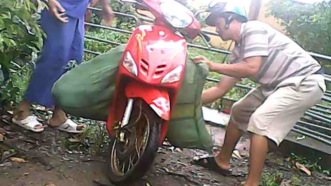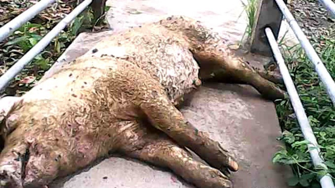 Sáng 6/8, cánh cửa sắt của trại chăn nuôi heo thực nghiệm Cargill hé mở. Ông Đạt chạy xe tay ga Mio màu đỏ vào sâu trong khuôn viên trại để nhận heo chết. Tại ngay lối vào khu vực nuôi heo, một con heo khoảng 40kg chết cứng nằm dưới nền xi măng. Toàn thân heo dính đầy phân, bụng trương phình và ruồi nhặng bu kín. Sau một vài thao tác lật ngửa heo chết lên kiểm tra, ông Đạt “chê” heo nhỏ quá nhưng liền sau đó lại xách heo chết bỏ vào trong bao tải, khệ nệ chất trước bửng xe, rồi chở heo chạy ra khỏi trại đưa đi tiêu thụ.