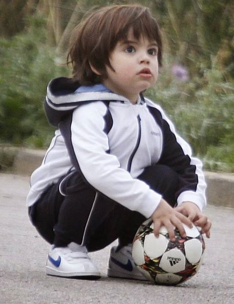 | Quý tử của ngôi sao Barca thích thú khi được chơi bóng. |