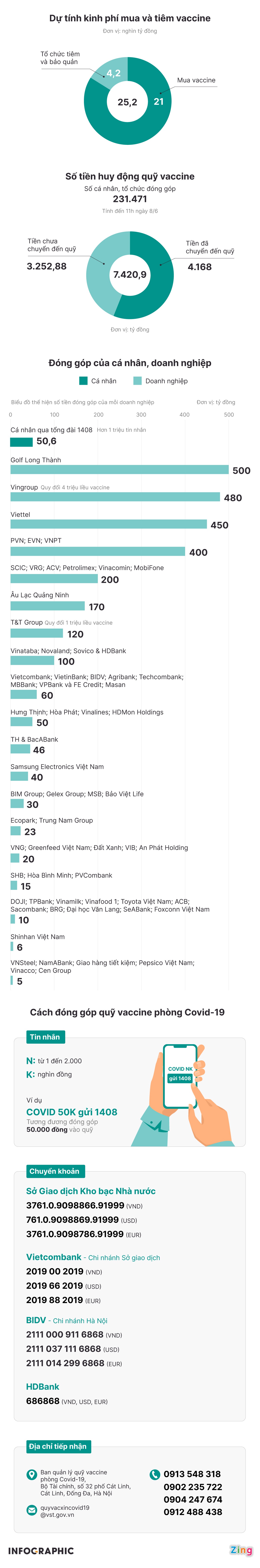 Đến trưa 8/6, số tiền đã chuyển vào quỹ vaccine là 4.168 tỷ đồng, số cam kết mà chưa chuyển là 3.252 tỷ. Tổng đài 1408 cũng tiếp nhận 1,04 triệu tin nhắn ủng hộ.