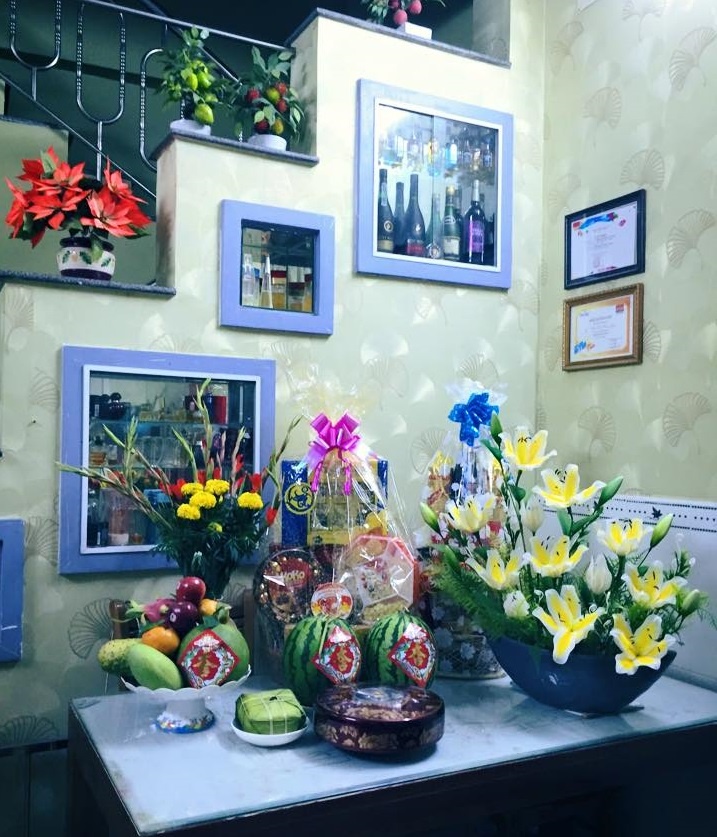 | Nhà Khả Ngân được trang trí mâm ngũ quả, dưa hấu, bánh chưng, bánh mứt.... những món quen thuộc trong ngày Tết. |