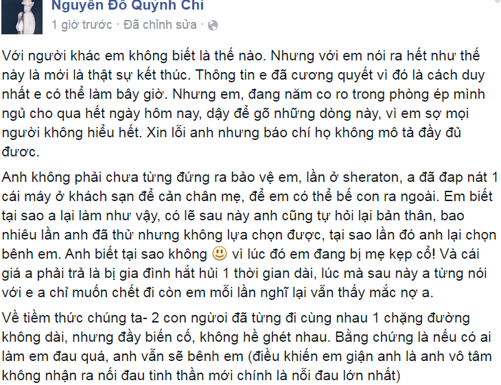 | Dòng chia sẻ mới nhất của Quỳnh Chi viết về mâu thuẫn với đại gia Diệu Hiền. |