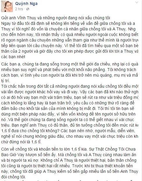 Sau một thời gian giữ im lặng trước vụ việc ông xã bị Vĩnh Thụy tố quỵt nợ 1,6 tỷ đồng, tối 27/12, nữ ca sĩ Quỳnh Nga quyết định lên tiếng để bảo vệ danh dự cho Doãn Tuấn trên trang cá nhân. Theo đó, cô cho biết mình không muốn nhắc tới vụ rắc rối này vì đó vốn là chuyện cá nhân giữa chồng cô và người mẫu Vĩnh Thụy. Nhưng do có nhiều người không biết rõ ngọn nguồn sự việc nhưng vẫn tham gia đơm đặt câu chuyện nên buộc lòng cô phải lên tiếng.