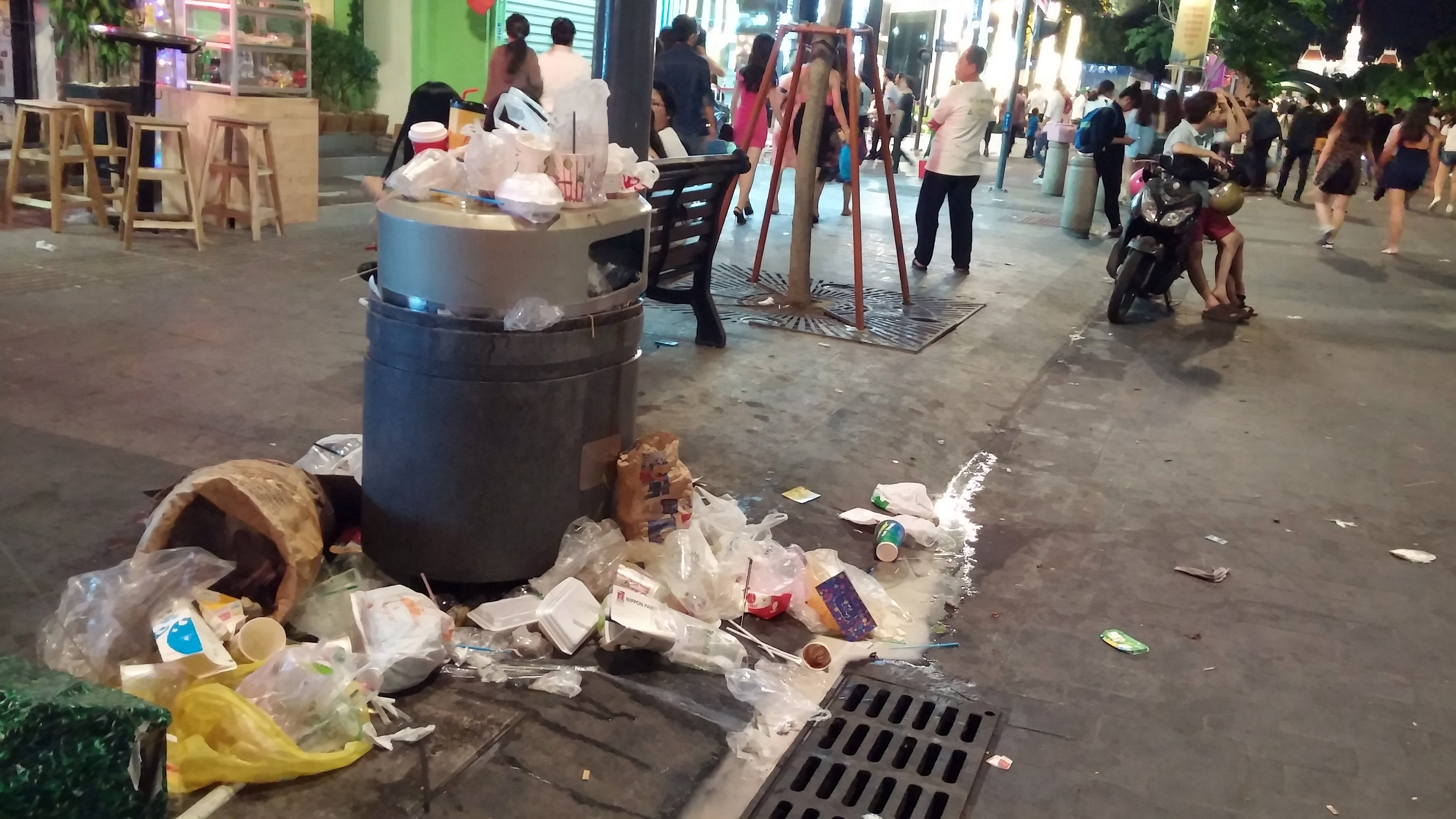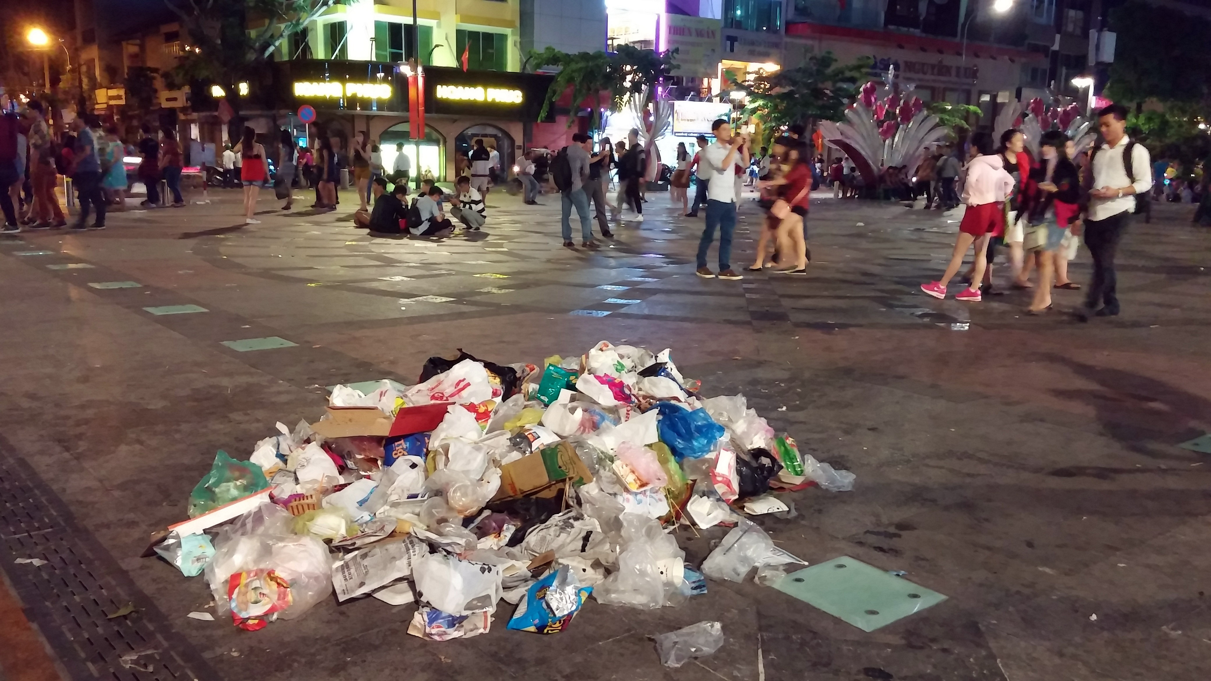 | Theo ghi nhận của phóng viên, tại phố đi bộ Nguyễn Huệ, những thùng rác được bố trí dọc hai bên nhưng không chứa hết lượng rác thải mà người đi xem pháo hoa để lại. |