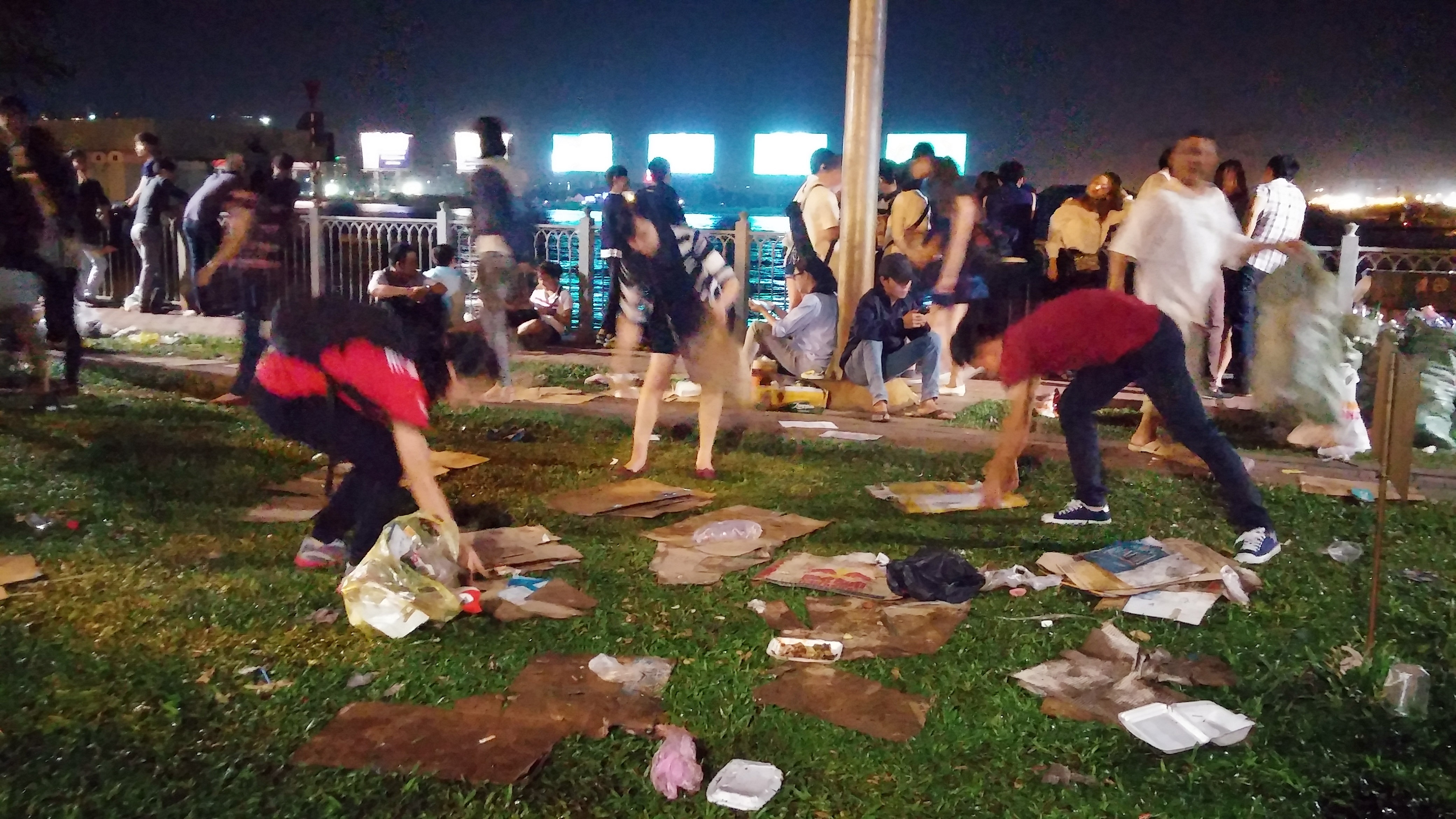 | Sau khi pháo hoa kết thúc, nhóm của Song đã tình nguyện ở lại dọn dẹp thu gom rác thải tại bãi cỏ ven bờ sông Sài Gòn và đường Tôn Đức Thắng. "Tụi em muốn những hành động của mình sẽ góp phần nhắc nhở được người dân có ý thức trong việc giữ gìn vệ sinh chung, đặc biệt là tại các ngày lễ hội lớn như hôm này", Song nói. |