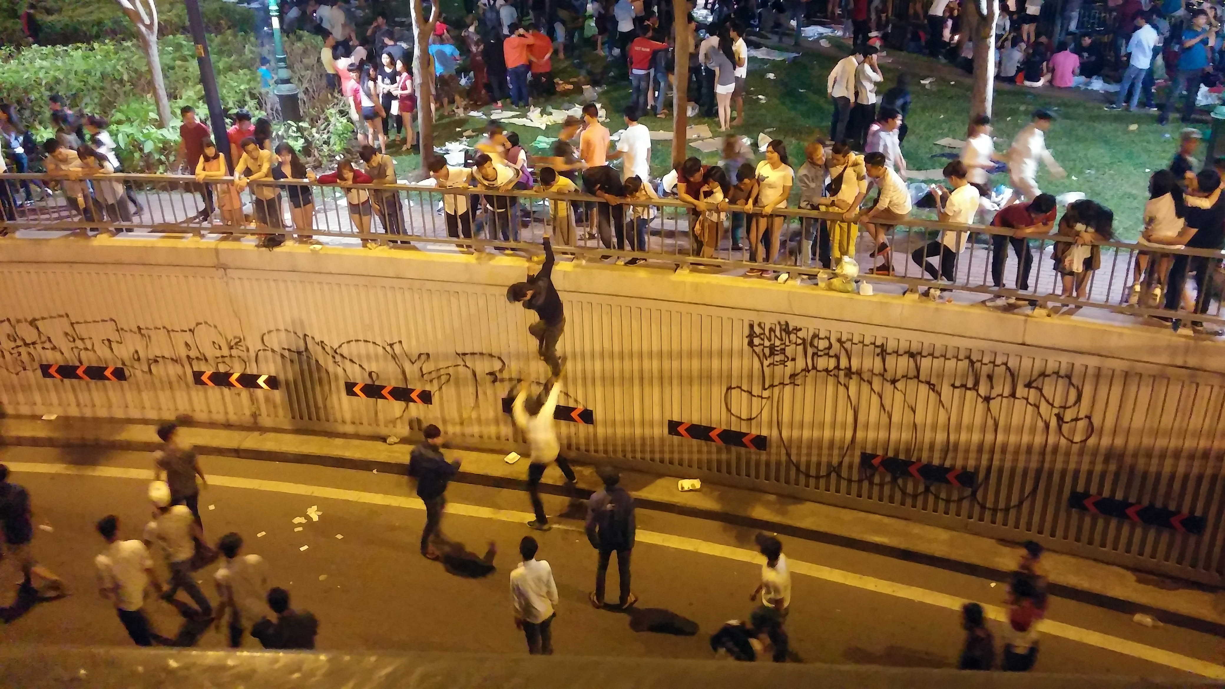 | Bên cạnh việc làm ý nghĩa của nhiều nhóm bạn trẻ đã dành thời gian thu gom rác sau màn pháo hoa, một số thanh niên theo có mặt tại khu vực hầm chui cầu Khánh Hội đã có những hành vi gây nguy hiểm. Những người này vì muốn về nhà nhanh đã la hét, cổ vũ cho một số thanh niên nhảy từ độ cao hơn 3 m từ công viên ven bờ sông xuống khu vực hầm khiến nơi đây náo loạn, ồn ào. |