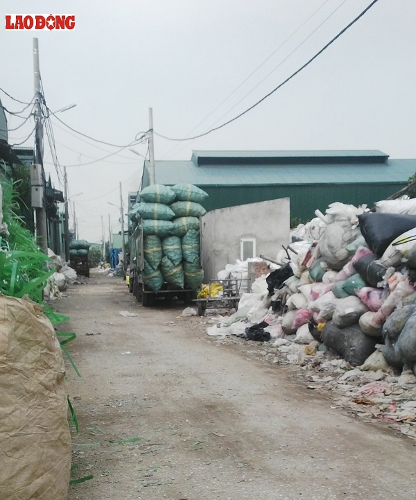 Giữa lúc đó, hai xe tải chở nhựa phế thải, nhựa sơ chế về Hưng Yên tái chế. Trong ngôi nhà “Lưu giữ chất thải nguy hại” có 2 người đang mở nắp các xe rác màu vàng (rác thải nguy hại) ra để chọn lựa, phân loại, rửa ráy, xay nghiền. Một phụ nữ, nghe nói là cán bộ y tế về nghỉ chế độ đang cắt từng ống truyền dịch, dây truyền ra thành từng khúc.