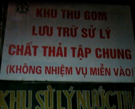 Đi qua sườn của nhà tang lễ, chúng tôi thấy một khu cổng sắt gỉ, khóa và xích cũng rỉ nát bẩn thỉu. Trên tầm cao độ 2 - 3 m, có một tấm biển cũ, to đùng và… sai chính tả: “Khu thu gom lưu trữ sử (viết “s” thay vì “x”) lý chất thải tập chung (viết “ch” thay vì “tr”). Khu sử (viết “s” thay vì “x”) lý nước thải. Không nhiệm vụ miễn vào”.