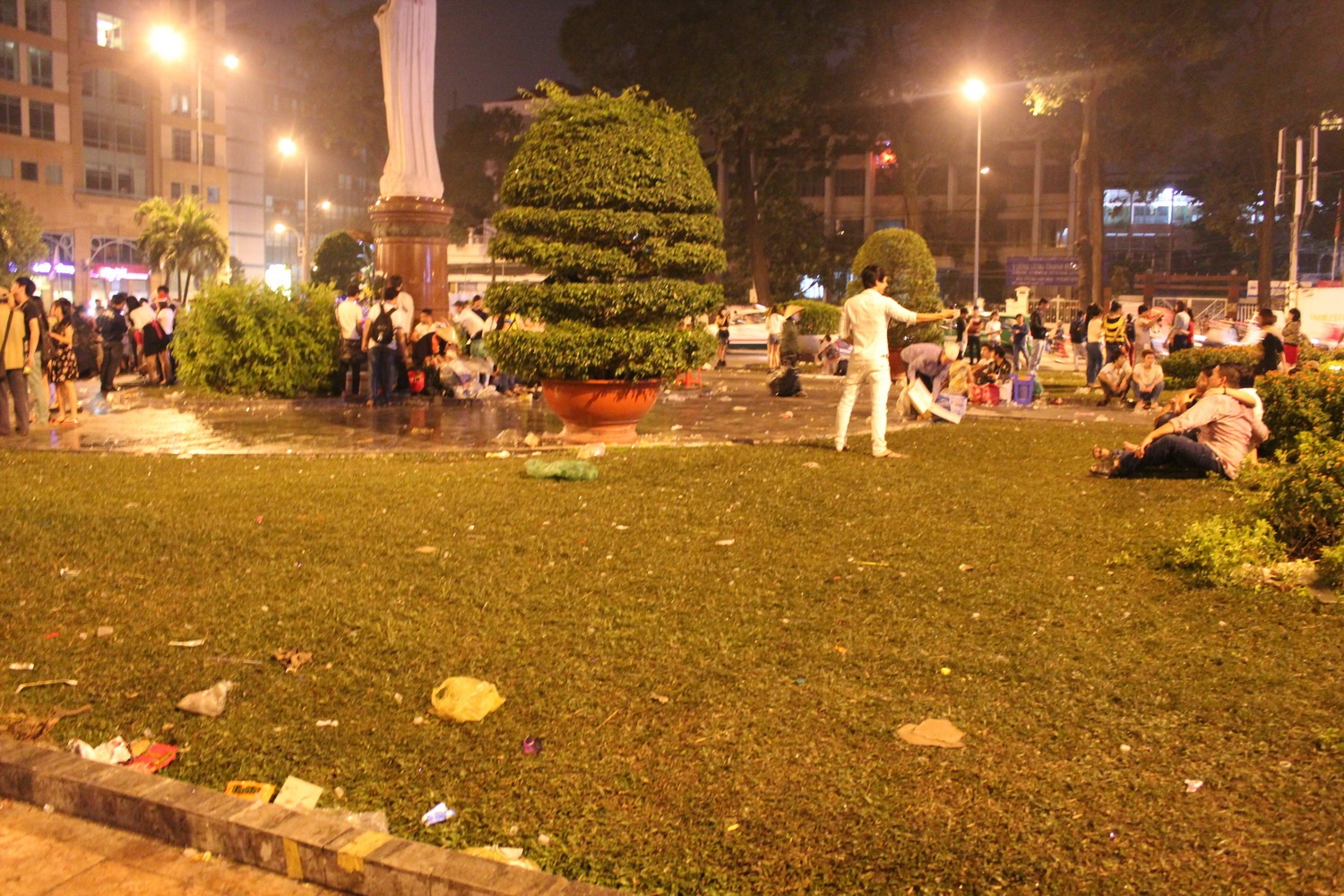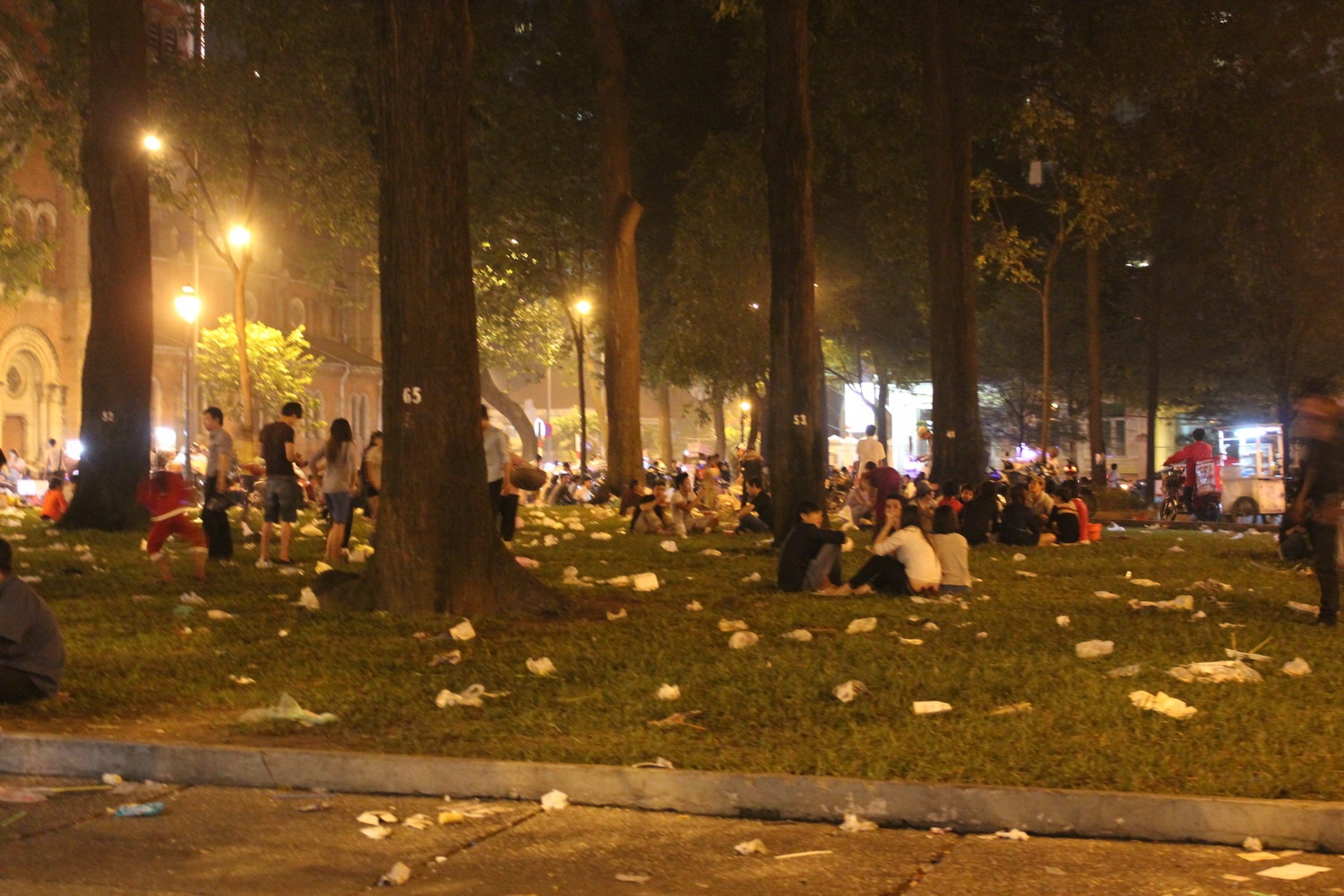 | Bãi cỏ trước Nhà thờ Đức Bà bị dẫm tan nát và đầy rác. Đến 2h sáng, nhiều người vẫn còn vui chơi và xả rác tại khu vực này |