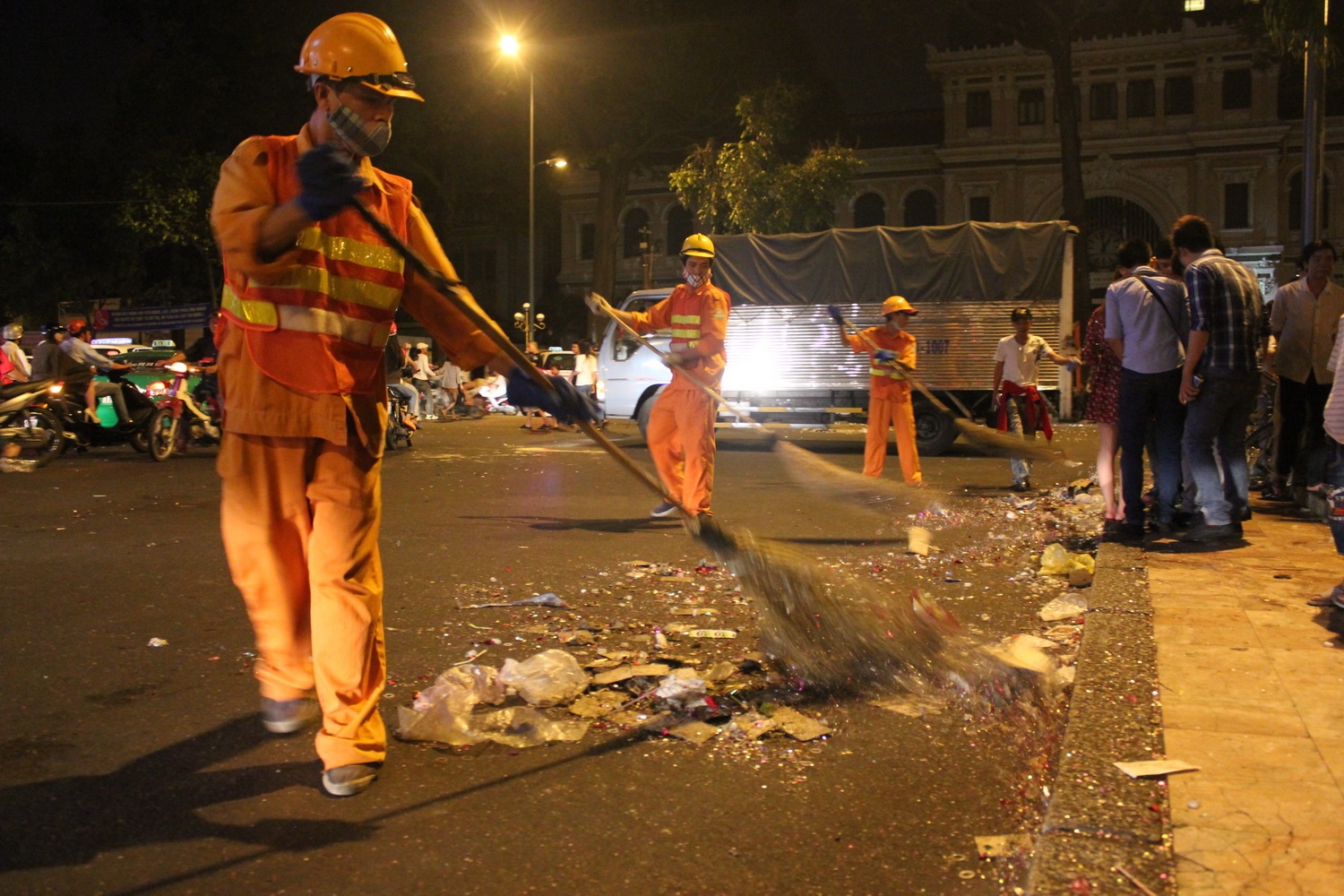 | Các công nhân quét rác có một đêm làm việc vất vả để lấy lại sạch sẽ cho đường phố Sài Gòn vào sáng sớm |