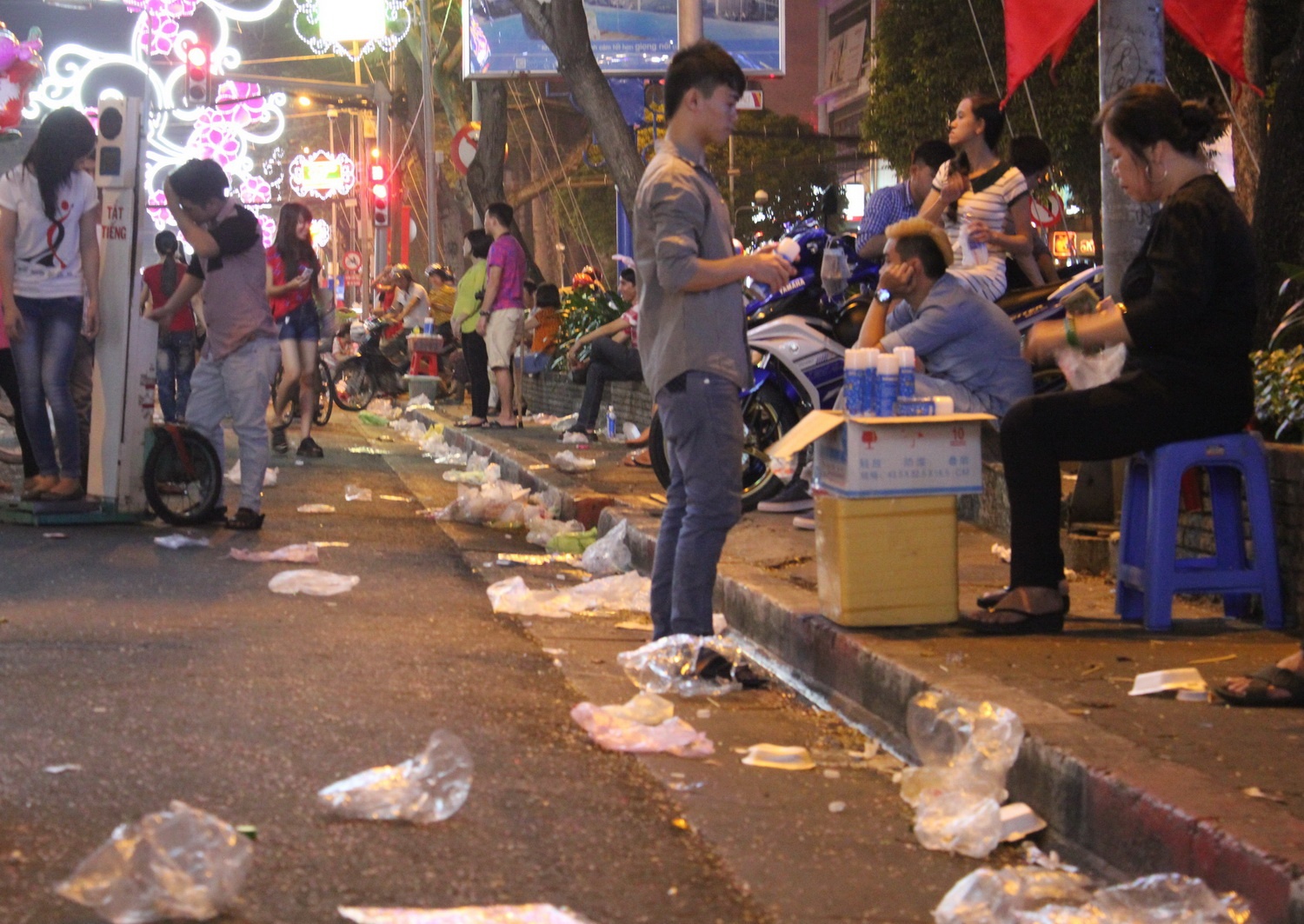 | Các tuyến đường thu hút rất đông người tham quan như Lê Lợi, Nguyễn Huệ, Đồng Khởi, Lê Duẩn...ở trung tâm thành phố tràn ngập các loại bao nilon, hộp xốp. |