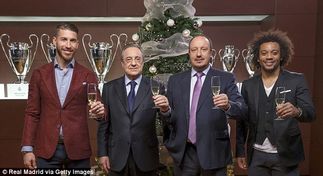 | Đội trưởng Ramos, đội phó Marcelo cùng HLV Benitez và chủ tịch Perez gửi lời chúc Giáng sinh và năm mới đến CĐV Real Madrid. Ảnh: Getty. |
