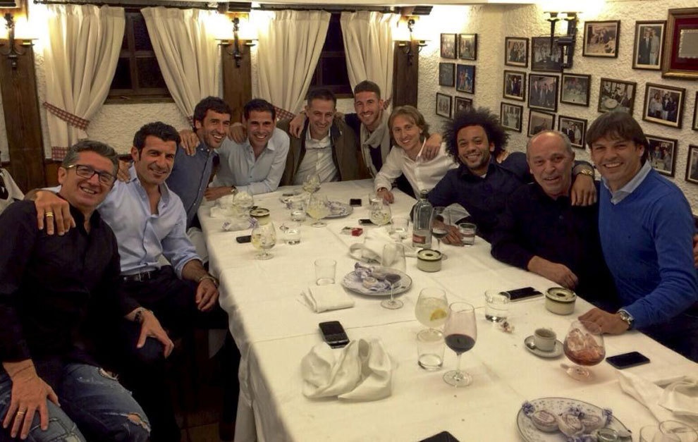 | Ramos cùng Marcelo và Modric tham dự buổi tiệc cùng các huyền thoại Real. Ảnh: Instagram. |