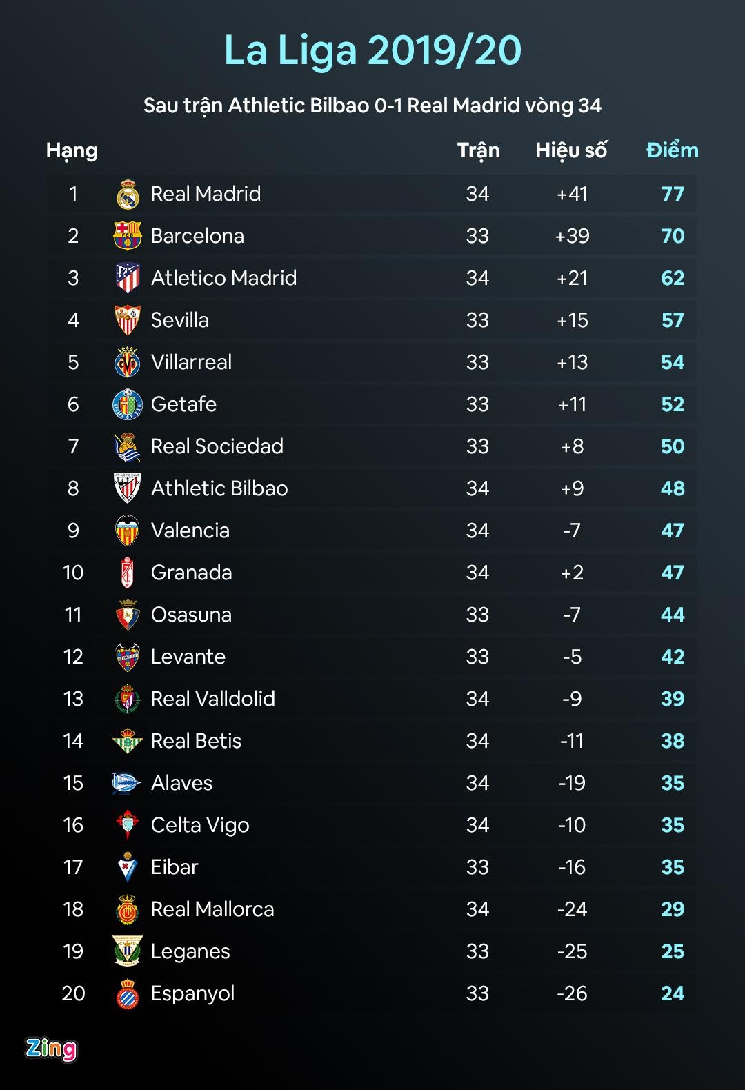 | Real Madrid với kinh nghiệm đã không cho đối thủ cơ hội chọc thủng lưới. Ramos, Militao cùng đồng đội chơi khôn ngoan để khiến Bilbao hoàn toàn bất lực trong phần còn lại của hiệp 2. Trận đấu khép lại với thắng lợi 1-0 dành cho "Los Blancos". Với kết quả này, thầy trò HLV Zidane gia tăng khoảng cách với Barca lên thành 7 điểm. |