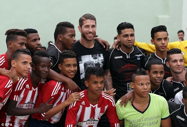 | Sergio Ramos chụp ảnh cùng các CĐV trong chuyến đi đến Havana, Cuba với vai trò đại sứ của UNICEF. Ảnh: EPA. |