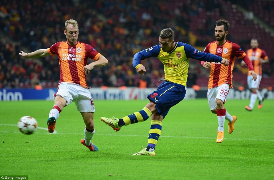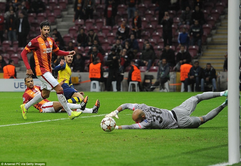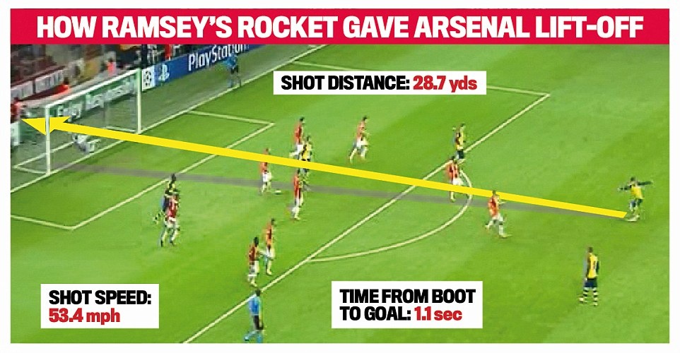 Phút 29, cuộc đọ sức giữa Galatasaray và Arsenal, từ quả đá phạt góc bên cánh trái của Joel Campbell, tiền vệ Aaron Ramsey tung cú demi-volley bằng chân trái từ khoảng cách hơn 26 m.