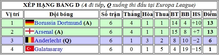 Giành chiến thắng đậm 4-1 nhưng Arsenal vẫn không thể lấy được ngôi đầu bởi ở trận đấu cùng giờ, Borussia Dortmund đã có được điều kiện cần với trận hòa 1-1 trước Anderlecht. Dù cùng có được 13 điểm nhưng do sở hữu hiệu số tốt hơn nên đại diện nước Đức sẽ tham dự lễ bốc thăm vòng knock-out với tư cách đội đầu bảng D.