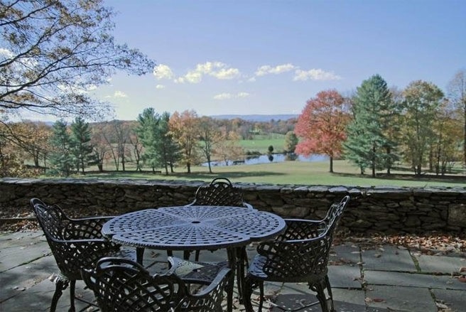 | Một sân hiên bằng đá nhìn xuống ao và những ngọn đồi thoai thoải. |