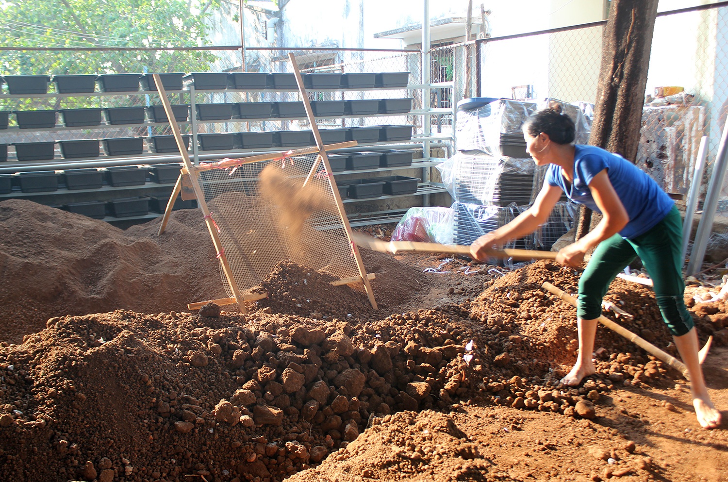 Bà Trịnh Thị Thu Hằng, chủ vườn rau giống sạch này cho biết, mỗi chậu giống khách sẽ thu 1–3 kg rau xanh tùy loại. Theo bà Hằng, với mức giá 35.000 đồng đầu tư ban đầu, khách hàng vừa tiết kiệm được tiền đi chợ, vừa đảm bảo nguồn rau sạch cho gia đình. Việc tưới nước và thu hoạch rau không mất nhiều nhiều thời gian.| Việc chọn loại đất trồng đóng vai trò quan trọng trong việc sản xuất ra những chậu rau sạch này. Ảnh: Zen Nguyễn. |