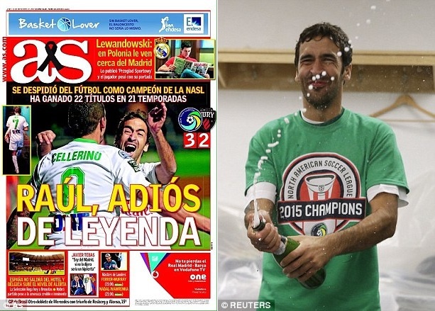 | Tờ báo thân Real Madrid, AS đưa tin về thành công của Raul trong màu áo New York Cosmos. |