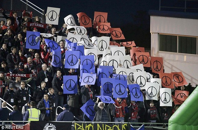 | Khán giả tới sân cổ vũ giơ cao những tấm biển in tháp Eiffel để tưởng nhớ nạn nhân vụ khủng bố tại Paris ngày 13/11. |