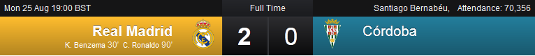 Đúng lúc này trọng tài thổi còi kết thúc trận đấu giữa Real và Cordoba. Chung cuộc, đội quân của HLV Carlo Ancelotti giành chiến thắng với tỷ số 2-0.