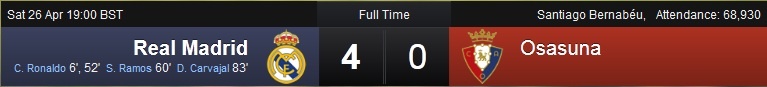 Với bàn thắng thứ 2 vào lưới Osasuna, Ronaldo nâng tổng số pha lập công tại La Liga mùa này lên con số 30, quân bình khoảng cách của Luis Suarez trong danh sách Vua phá lưới châu Âu.