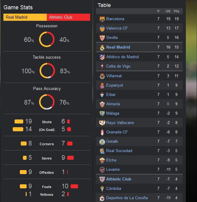 Chiến thắng giúp Los Merengues đẩy đối thủ Atletico Madrid xuống vị trí thứ 5, trong khi Bilbao chưa thể thoát khỏi nhóm có nguy cơ xuống hạng. Hiện, Real ghi tới 25 bàn sau 7 trận ở La Liga, trong đó có hơn 1/2 số bàn thắng thuộc về Ronaldo.