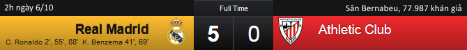 - Trận đấu khép lại sau 2 phút bù giờ, với chiến thắng chung cuộc 5-0 dành cho Real Madrid. Trận thắng giúp Real soán ngôi số 4 của kình địch cùng thành phố Atletico.