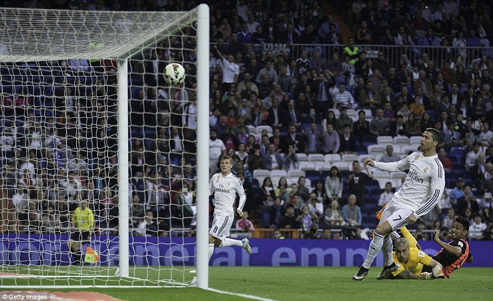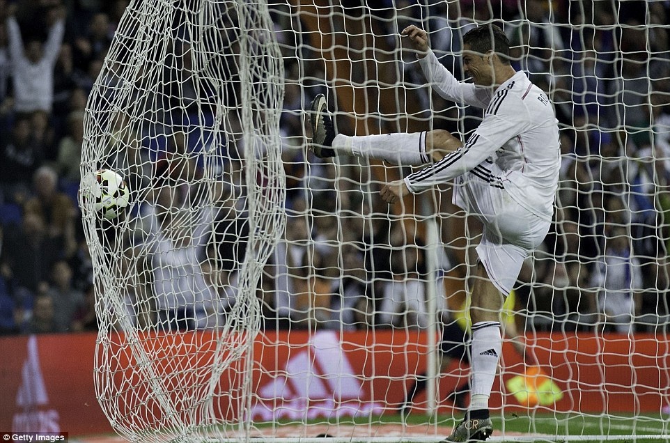| Ronaldo vui mừng khi Real có bàn thắng thứ hai sau pha đưa bóng về lưới đội nhà Almeria của Mauro Dos Santos. |