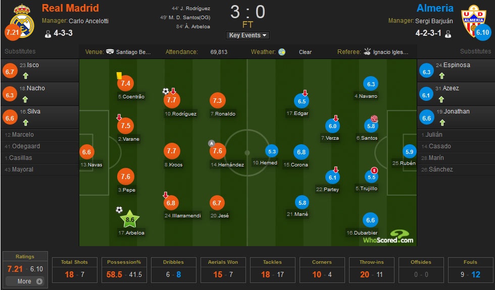 | Chicharito tiếp tục được đá chính, nhưng không ghi bàn. Hậu vệ Alvaro Arbeloa là cầu thủ ấn định chiến thắng 3-0 cho Real. |