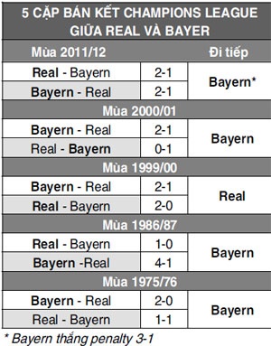 5 lần đụng độ Bayern ở bán kết Champions League (Cúp C1) trước, có tới 4 lần Real bị đối thủ loại khỏi cuộc chơi. Nhưng ở lần duy nhất giành chiến thắng ở mùa giải 1999/00, Real đã đăng quang. Đó cũng là điều mà những người Madrid đang nghĩ tới để biến giấc mơ decima thành hiện thực với chức vô địch Champions League thứ 10 trong lịch sử.