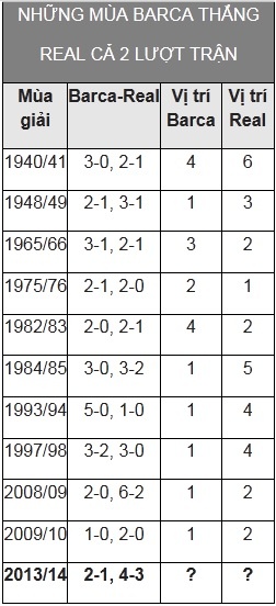 Đây là lần thứ 11 trong lịch sử, Real Madrid thua Barca cả 2 lượt trận ở La Liga. Và ở 10 lần thua tuyệt đối trước đại kình địch, Kền kền trắng chỉ có đúng 1 lần lên ngôi vào cuối mùa (1975/76). Ngược lại, Barca đã vô địch La Liga ở 6/10 lần thắng cả 2 trận Kinh điển lượt đi và về trước đó. Trong 3 lần còn lại, đội đăng quang là Bilbao (1982/83) và... Atletico (1940/41, 1965/66).