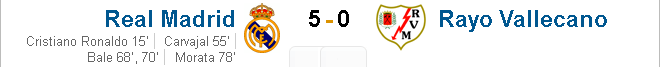 Chiến thắng đậm 5-0 của Real khép lại với siêu phẩm cứa lòng của Morata. Với 3 điểm giành được, Real (73 điểm) tiếp tục bám đuổi Atletico Madrid (76 điểm, vừa đánh bại Athletic Bilbao 2-1) và Barca (75 điểm, thắng Espanyol 1-0 nhờ quả penalty của Messi).