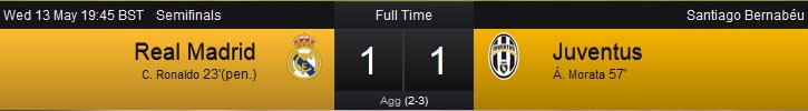 Kết thúc trận bán kết lượt về, Real hòa Juve 1-1. Sau 2 lượt trận, CLB Hoàng gia thua chung cuộc 2-3 và trở thành cựu vương Champions League.