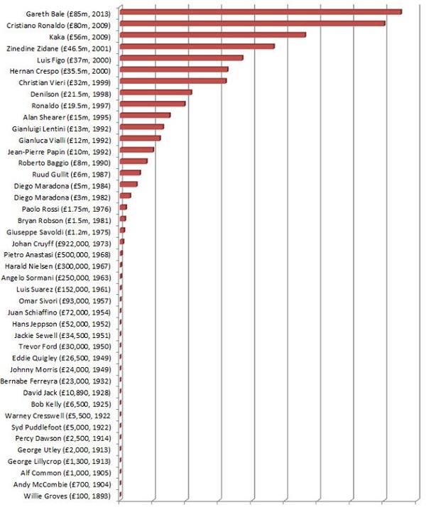 Bạn đọc có thể xem ở bảng dưới: Các kỷ lục chuyển nhượng tăng dần trong 20 năm qua, giá cầu thủ ngày càng đắt, đi cùng sự bùng nổ về tài chính từ khi bóng đá gắn với truyền hình.