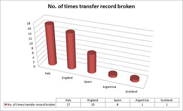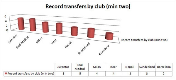 Ngoài Real Madrid, các CLB Italia là những kẻ hay phá giá chuyển nhượng nhất. Juventus đã có 5 lần lập kỷ lục về giá chuyển nhượng, bằng Real. Milan và Inter cũng đã từng có 4 lần.