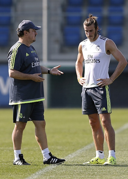 | Rafael Benitez nói chuyện với Gareth Bale trên sân tập. Cầu thủ người xứ Wales có lẽ vẫn chưa hiểu vai trò của mình trong đội hình Real mùa tới. |