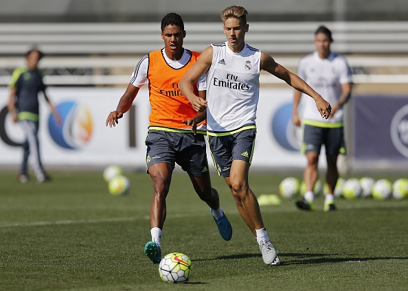 | Marcos Llorente (phải) là tiền vệ trẻ sinh năm 1995 của Real Madrid và được đôn lên đội một mùa giải 2015 - 2016. Anh có pha tranh bóng với trung vệ Raphael Varane. |