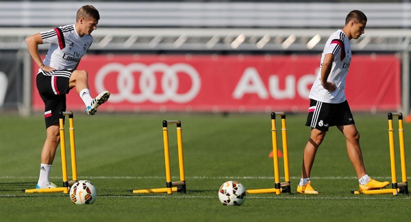 | Tiền vệ tân binh Toni Kroos (trái) khá tích cực trong buổi tập ở trung tâm huấn luyện Ciudad. |