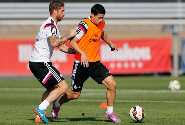 | Trung vệ đội phó Sergio Ramos tranh bóng quyết liệt với James Rodriguez. |