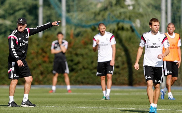 | HLV Ancelotti trực tiếp hướng dẫn các học trò tập luyện. |