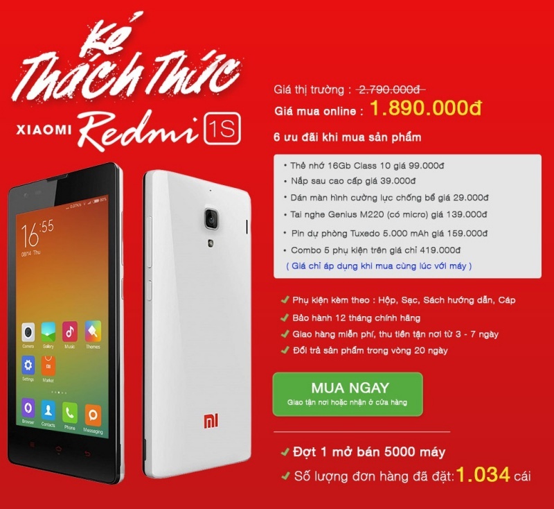 | Hnam Mobile mở bán Xiaomi Redmi 1S đợt 1 với số lượng 5.000 máy. |