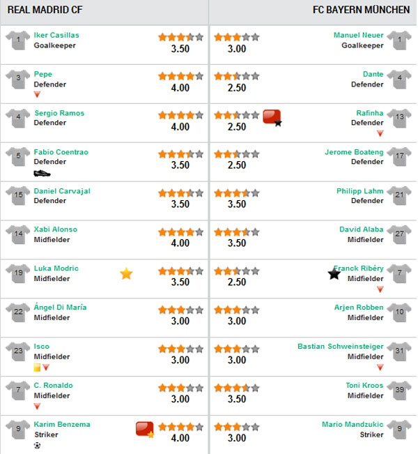 Chứng kiến màn trình diễn nhạt nhòa của Ribery, độc giả trang Goal tặng anh ngôi sao đen (cầu thủ gây thất vọng nhất). Ở trận bán kết lượt đi trước Real, tiền vệ người Pháp chỉ rê bóng thành công 1 lần và không có bất cứ cú dứt điểm nào về phía khung thành đối phương.
