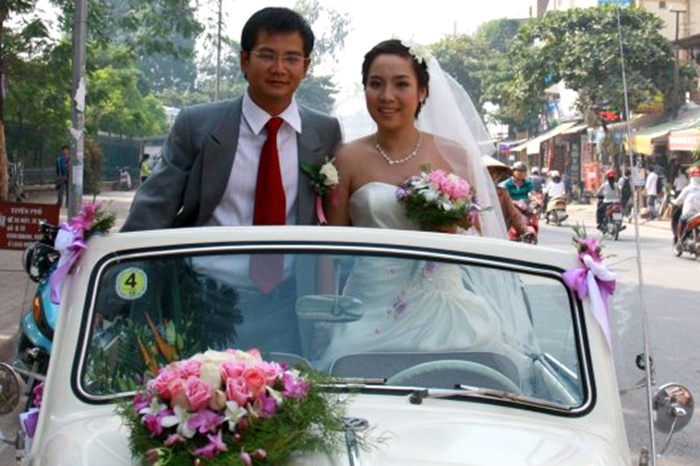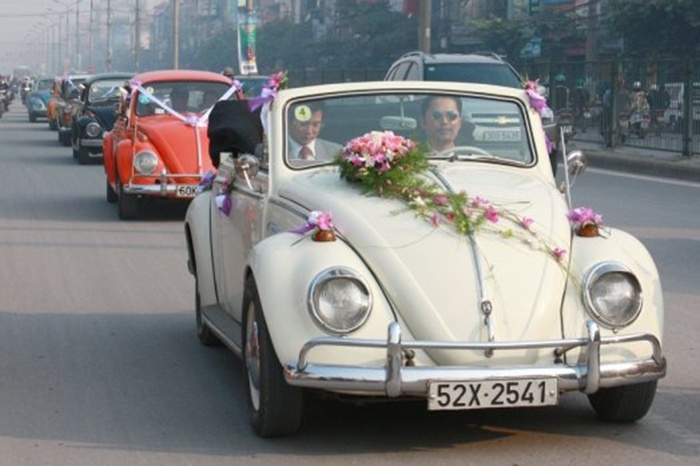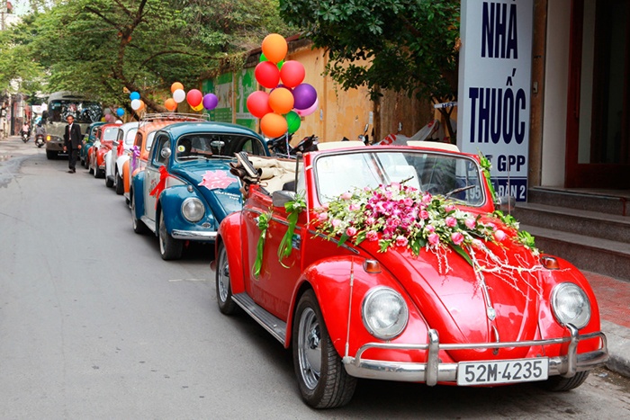 | Nhiều cặp đôi còn quyết định thuê cả dàn xế cổ để rước dâu. Một chiếc xe hoa này có giá thuê là 5 triệu bao tài xế, nhưng chỉ chạy ở nội thành. |